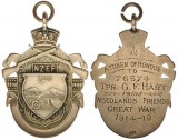 WOODLANDS, uniface, struck in gold (9ct, 9.3g, 40x31mm), no maker, ring top suspension, reverse inscribed 'A Token Of Honour/To/76574/Tpr. G.F.Hart/From/Woodlands Friends/Great War/1914-19'. Very fine.