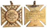 FOB MEDAL, handcrafted in gold (9ct, 6g, 24x32.5mm), by D Ltd D, ring top suspension, reverse inscribed 'Presented By/"Beggs"/1919.' Very fine.