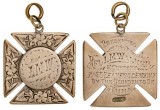 TIRAU, fob medal, handcrafted in gold (9ct, 7.4g, 37x32mm), uncertain maker, ring top suspension, reverse inscribed 'Presented to/Private John Long/By the Residents of Tirau/On the ...
