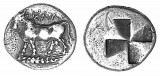 THRACE, Byzantion, (357-340 B.C.), silver tetrobol, (2.5 grams), obv. cow standing to left, foreleg raised, above **PU*, dolphin below, rev. quadripartite incuse square of mill-sail ...