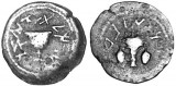 PALESTINE, Roman Procurator of Judaea, Pontius Pilate, under Tiberius, (A.D. 26-36), copper prutah, obv. three bound ears of barley, partial legend around, rev. libation ladle ...