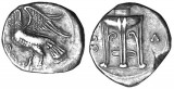 ITALY, Bruttium, Croton, (420-390 B.C.), silver stater, (7.79 grams), obv. eagle standing to left, on olive branch with open wings, rev. tripod-lebes with neck and ...