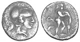 ITALY, Bruttium, Croton (Kroton), (299-281 B.C.), silver diobol (1.14 grams), obv. Athena head right, wearing crested Corinthian helmet, traces of KPOTR above, rev. Herakles standing ...