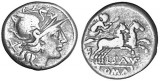 ANONYMOUS SERIES, (157-156 B.C.), silver denarius, Rome mint, (3.812 grams), obv. Roma helmeted head right, X behind, rev. Victory in biga to right, [ROMA] in ...