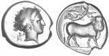 ITALY, Campania, Nola, (c.385-380 B.C.), silver stater or nomos, Group II, (6.84 grams), obv. female head to right, rev. man-headed bull walking to right, Nike ...