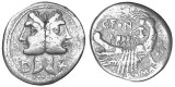 CN LUCRETIUS TRIO, (136 B.C.), silver denarius, Rome mint, (3.866 grams), obv. helmeted head of Roma to right, X below, TRIO behind, rev. Dioscuri galloping ...