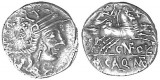 ROMAN REPUBLIC, Cn. Fulvius, Marcus Calidius, and Q. Metellus, (117-116 B.C.), silver denarius, Rome mint, (3.875 grams), obv. Roma helmeted head right, ROMA behind, * ...