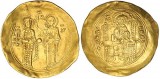 JOHN II, (1118-1143), gold hyperpyron, Constantinople mint, obv. Christ enthroned facing wears nimbus, in hand the Gospels, +KERO H**Q*EI around, rev. facing figures of ...