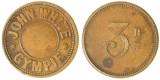JOHN WHITE, Gympie, threepence in brass (27.5mm) milled edge. Good very fine and rare.