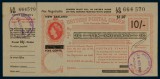 ELIZABETH II, British Postal Order, ten shillings, issued 24.11.1969 at Lambton Quay New Zealand, overprinted "New Zealand", $1.07" and "five cents" poundage, with counter foil. ...