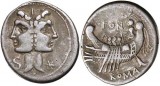 C. FONTEIUS, (114-113 B.C.), silver denarius, (3.82 grams), obv. Janus head, T to left, * to right, rev. galley with pilot and three rowers, C.FONT ...