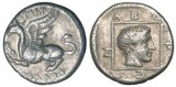 PAEONIA, Kingdom of, Patraos, (c.340-315 B.C.), silver tetradrachm, (12.160 grams), obv. head of Apollo to right, with laureate, rev. horseman spearing fallen enemy, who holds ...