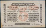 GOVERNMENT OF INDIA, five rupees, universalised issue (no circle letter), 1 January 1919, signature Gubbay, GC/31 522559 (P.A6g; Jhun.1.6.1). Vertical folds and horizontal fold, several ...