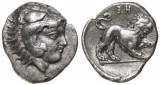 ITALY, Lucania, Herakleia, (432-420 B.C.), silver diobol, (1.04 grams), obv. head of young Herakles to right, wearing lion skin, rev. lion running right, E H ...