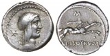 REPUBLICAN, Furius Purpurio, (c.169-158 B.C.), silver denarius, Rome mint, (4.18 g), obv. helmeted head of Roma to right, X behind, rev. Diana or Luna in ...