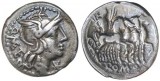 CN LUCRETIUS TRIO, (136 B.C.), silver denarius, Rome mint, (3.86 g), obv. helmeted head of Roma to right, X below before neck, TRIO behind, rev. ...