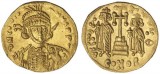JUSTIN II, (A.D.565-578), gold solidus, Constantinople mint, 10th Officina, (4.45 g), obv. bust of Justin II facing, with plume and diadem, two pearls at each ...