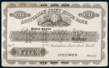 AUSTRALIAN JOINT STOCK BANK, Sydney, specimen one pound, back only on card, perforated SPECIMEN, (not illustrated in Vort Ronald, Australian Private Banknote Pedigrees). Good extremely ...