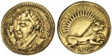 ANCIENT INDIA, Post Gupta, Cholas, Raja Raja Coinage (985-1014); Base gold 1/8-Kahavanu (7), Obv. tiger seated looking right at two upright fish, Rev. two-line Nagari ...