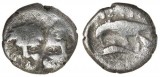 MOESIA INFERIOR, Istros, (400-350 B.C.), silver obol or trihemiobol, (1.01 g), obv. two young male heads facing, side by side, left upright, right inverted, rev. ...