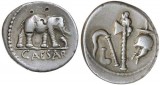 JULIUS CAESAR, (died 44 B.C.), silver denarius, issued 49-48 B.C., mint moving with Caesar, (3.64 g), obv. elephant to right, trampling on serpent, CAESAR in ...