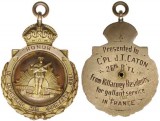 AUSTRALIA, WWI, tribute fob, in gold (9ct, 4.55g, 34x40mm), obverse, stylized crown above rifles angled across Australian arms, reverse inscribed, 'Pres/To/O.Williams/By.Residents/Of.Springfield/On.His.Ret/ From.The/War.' Very fine.