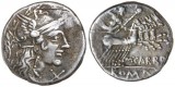 REPUBLIC, Anonymous, (157-156 B.C.), silver denarius, Rome mint, (3.39 g), obv. head of Roma to right, X behind, rev. Victory in biga to right, ROMA ...
