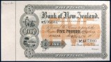 BANK OF NEW ZEALAND, five pounds sterling, Auckland, (18- printed), discordant numbers No.A063901 - No.A073900, printed both sides, officially perforated 'SPECIMEN B.W.& Co LONDON' (in ...