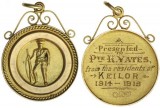 AUSTRALIA, World War I, tribute fob in gold (15ct, 6.1g, 26mm), obverse, soldier with rifle within circular frame, reverse inscribed 'Presented/to/Pte K.Yates/from the residents of/Keilor/1914-1918'. ...