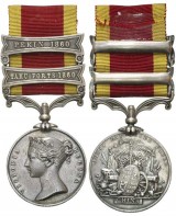 SECOND CHINA WAR MEDAL 1857-60, - two clasps - Taku Forts 1860, Pekin 1860. Chas Elgar, 1st Bn Mil. Train. Impressed and renamed. Contact marks ...