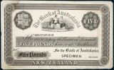 BANK OF NEW SOUTH WALES, specimen five pounds, Wellington, 1st August 1921, diagonal overprint twice, large left margin (P.S155). Nearly extremely fine and rare.