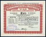 WORLD WAR II, Commonwealth of Australia, War Savings Certificate, Seven Year Series, large size, ten pounds, N 609845, issued 5 Nov 1943 at the Eng.Scot.& ...