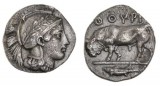 ITALY, Lucania, Thurium (Thourioi), (425 - 400 B.C.), silver nomos or stater (7.78 g), obv. helmeted head of Athena to right, helmet is decorated with ...