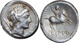PUB. CREPUSIUS, (82 B.C.), silver denarius, Rome mint, (3.91 g), obv. Apollo laureate head to right, sceptre over shoulder, rev. horseman galloping to right, hurling ...