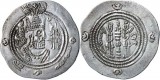 ARAB-SASANIAN PROTOTYPE ISSUE, Khusru II (A.D. 590 - 627), silver drachm or dirhem, (3.88 g), Darabgird mint, dated year 35 (A.D. 621), with word "praise" ...