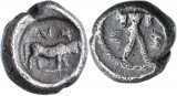LUCANIA, Sybaris, (453-448 B.C.), silver twelfth stater or obol, 7mm, (0.48 g), obv. Poseidon advancing right, wearing chlamys, brandishing trident, rev. bull standing right, MVB ...