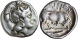 ITALY, Lucania, Thurium (Thourioi), (c.400-350 B.C.), silver nomos, stater or didrachm, (7.56 g), obv. head of Athena to right wearing crested Athenian helmet, ornamented with ...