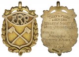 TUATAPERE AXEMEN'S ATHLETIC SOCIETY, c1913, fob medal, handcrafted in gold (15ct, 11.2g, 38x27mm), by W.Kerr (Sydney), ring top suspension, reverse inscribed 'Tuatapere/Axemen's/Athletic Society/18in UH Hcp. ...