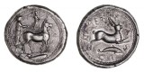 SICILY, Himera, (c.409-407 B.C.), silver tetradrachm, obverse die signed by the artist Mai-, (17.50 g), obv. the nymph Himera, holding reins in both hands, driving ...