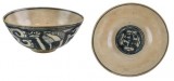 CHINA, Ming Dynasty, blue and white porcelain bowl (14cm dia.), underglazed dark blue decoration, exterior fish, flowers, and trees, interior nature scene inside two circles, ...