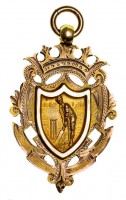 C OF C ASSOCIATION, prize fob in gold (9ct; 6.02g; 29x37mm), by W (Willis), ring top suspension, obverse inscribed, 'LS', reverse inscribed, 'C of C/Association/B. ...