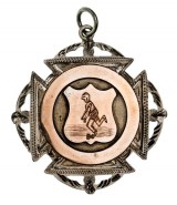 KINDRED SOCIETIES CHAMPIONSHIP, prize medal in voided silver with 9ct gold centrepiece (33x32mm), ring top suspension, reverse inscribed, 'C.Bolton./Kindred Societies/Championship/1928.'. Hairlines on centrepiece, otherwise ...
